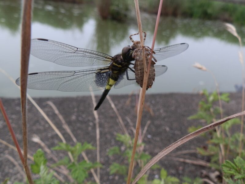 夏の羽化といえばセミですが、個人的にはセミに比べるとヤゴの羽化は比較的スピーディーに進む印象があります。見つけた時にはすでに羽を半分ほど広げていて、お昼ご飯を食べているうちに飛んで行くところまで見られました。