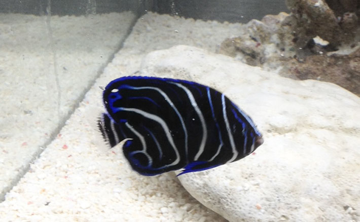 季節来遊魚として採集も可能ですが珍しい種になります。大型ヤッコのなかではデリケートで皮膚が荒れやすいのでエサはさまざまなものを与えましょう。上手に飼育すると1、2年で成魚となります。