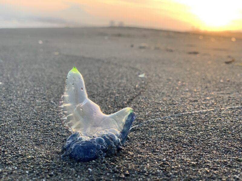 青く透き通った浮き袋と、たなびく長い触手。その神秘的な姿で知られるカツオノエボシは、海辺で見かけても決して触れてはいけない危険生物としても有名です。