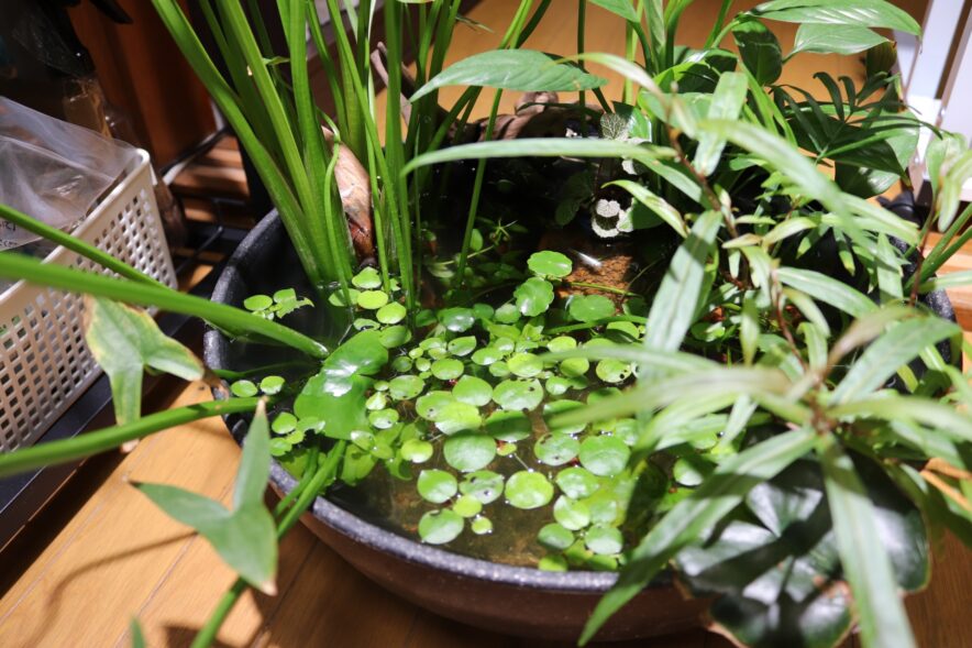 睡蓮鉢(提供:PhotoAC)最初のうちは、エサやりをしてもすぐに水草の影に隠れてしまいます。「出ておいで~」と言っても伝わるはずはなく、仕方なくこちらも窓の影から観察していると、ようやくエサを食べてくれました。