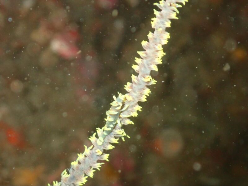 そして何より、触手の中にそっと佇むビシャモンエビを見つけた時の感動はひとしお。皆さんもぜひ、ダイビング中にムチカラマツを見つけたら小さなエビたちのことも探してみてください。