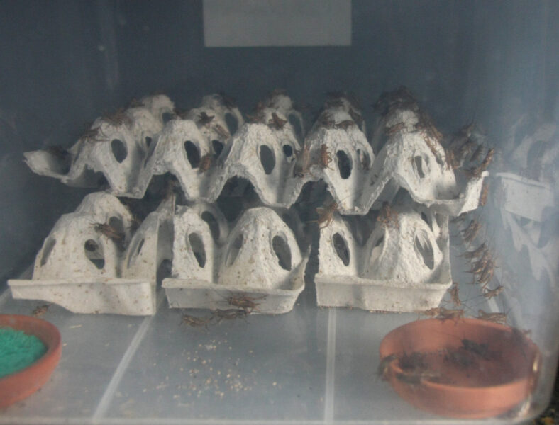 コオロギなどの昆虫もエサとなる(撮影:額田善之/撮影場所:足摺海洋館SATOUMI)野生では生きた魚や甲殻類、昆虫、小動物などを食べている生きものたちを健康に育てる工夫がなされています。