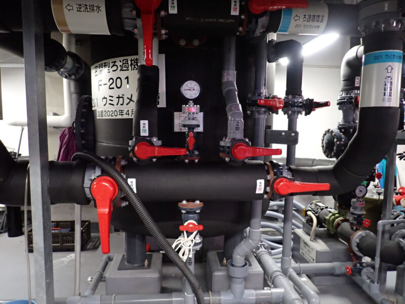 複雑な配管にびっくり(撮影:額田善之/撮影場所:足摺海洋館SATOUMI)足摺海洋館SATOUMIのバックヤードツアーは、水槽の裏側や展示前の生き物たちのケア、生きものの標本などの解説を受け、最後に大きな外洋水槽でのエサやりも体験できるという内容。