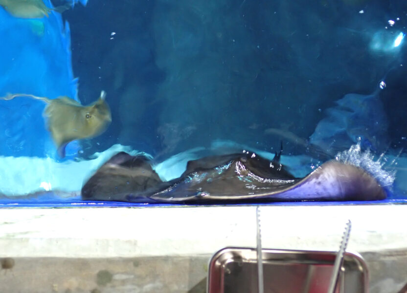 中でも目玉となるのが、小さな魚をトングで挟んで、水槽の上からエサやりをする体験です。食欲旺盛なエイたちが集まってきます。