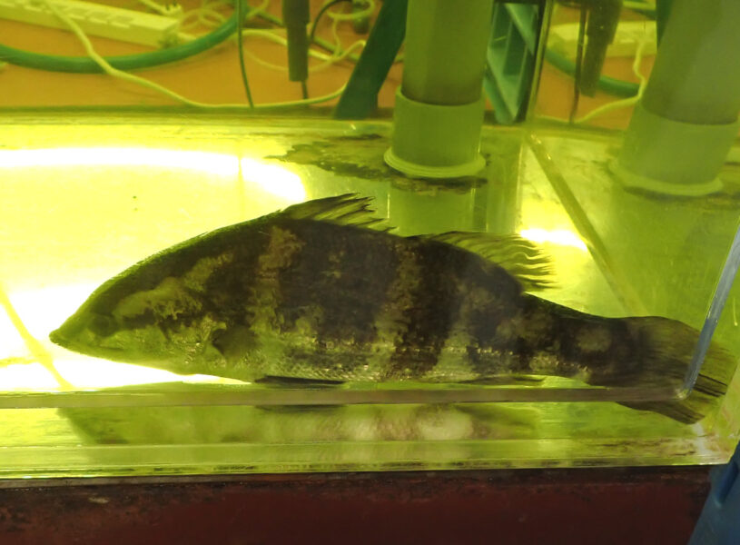 治療中のアカメの幼魚(撮影:額田善之/撮影場所:足摺海洋館SATOUMI)薬や栄養剤などが含まれる薬液でケアをしてから、健康であることが確認できると、表の水槽で展示することができます。