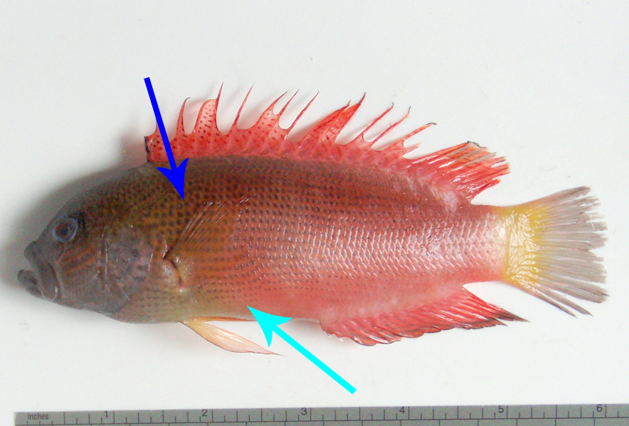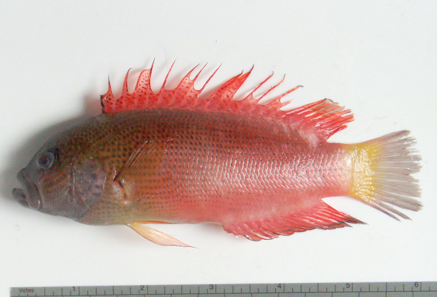 見た目はハタの仲間に似ていて顔つきもいかつい印象を与えますが、大きさはハタ科と比較して小ぶりで、大きくても全長20センチほど。体はピンクないし茶褐色で、美しい色をしています。