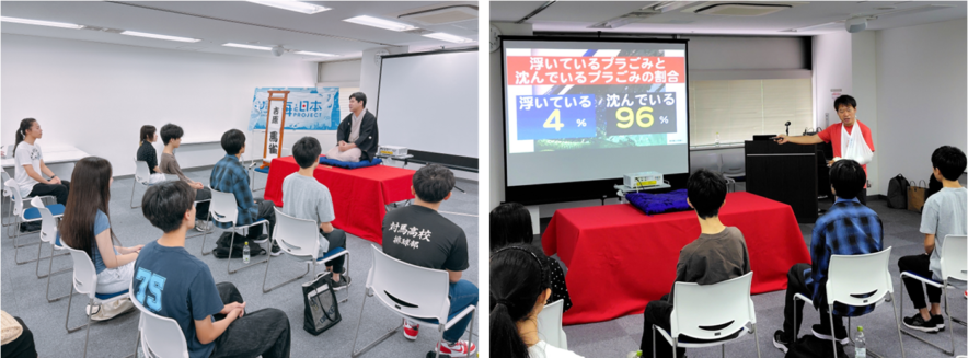 落語家・吉原馬雀さんによる「海落語」(左)と環境科学者・井手迫義和さんによる「アクティブラーニング」(提供:ソーシャルアクションネットワーク)落語家・三遊亭朝橘さんからは、落語を創作するための基本的な作法や技術、海落語ならではの考え方についてのレクチャーがあり、海の問題を笑いに変換して伝える「海落語」には、独創的なアイディアが求められることなどを学んだといいます。