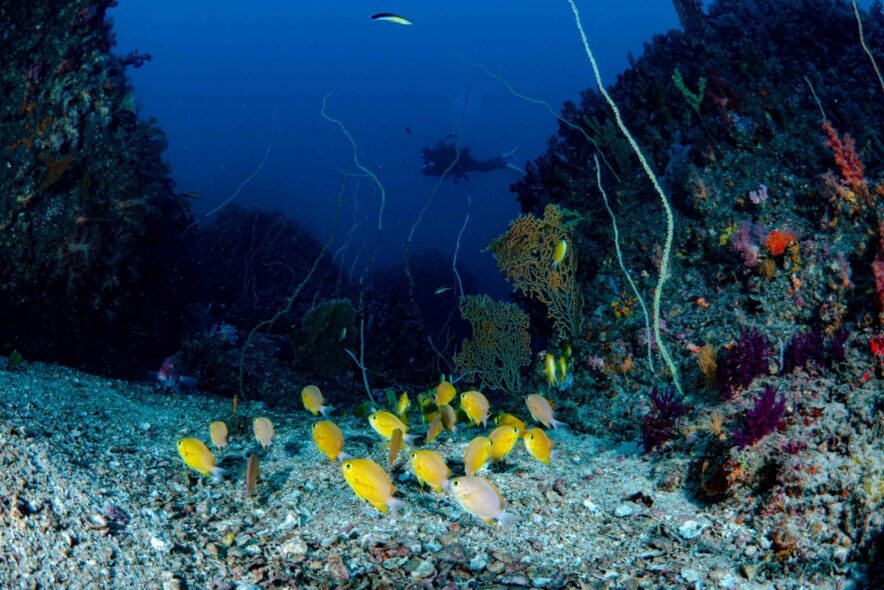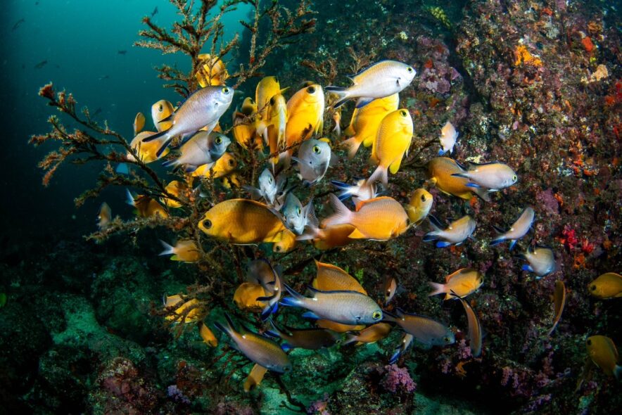静岡県伊豆・伊東でダイビングをしていると、変わったところで群れを作るコガネスズメダイという魚を観察することができます。