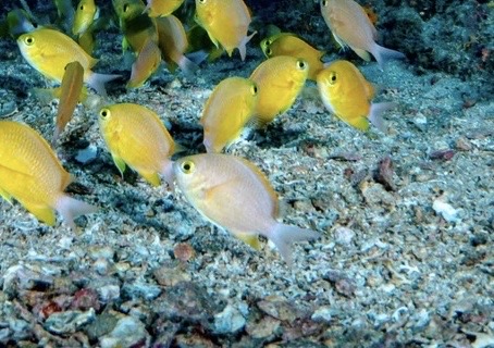 コガネスズメダイは黄色い体色にまるっとした体が特徴的で、伊豆・伊東の海では珍しくない魚。