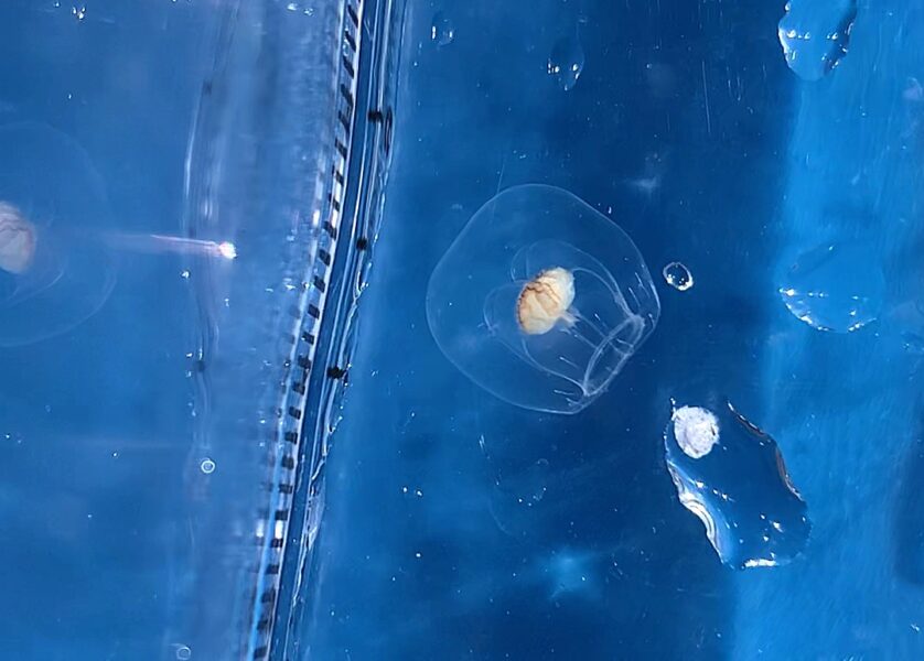 キヨヒメクラゲ(提供:俊甫犬)かなり透明度が高く目視での確認が難しいクラゲで、見つけるのにかなり苦労しましたが、かなり希少なクラゲなので水族館で展示される際は水槽の周りにかなり目立つレイアウトが施されます。