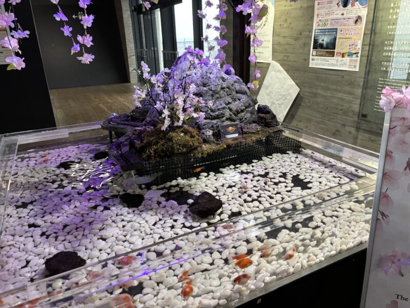 物語の舞台である「Umigatari-Castle」を表現したテラリウム水槽には、雪景色の城とその堀に泳ぐ忍者を想起させる黒いメダカを楽しむことができます。