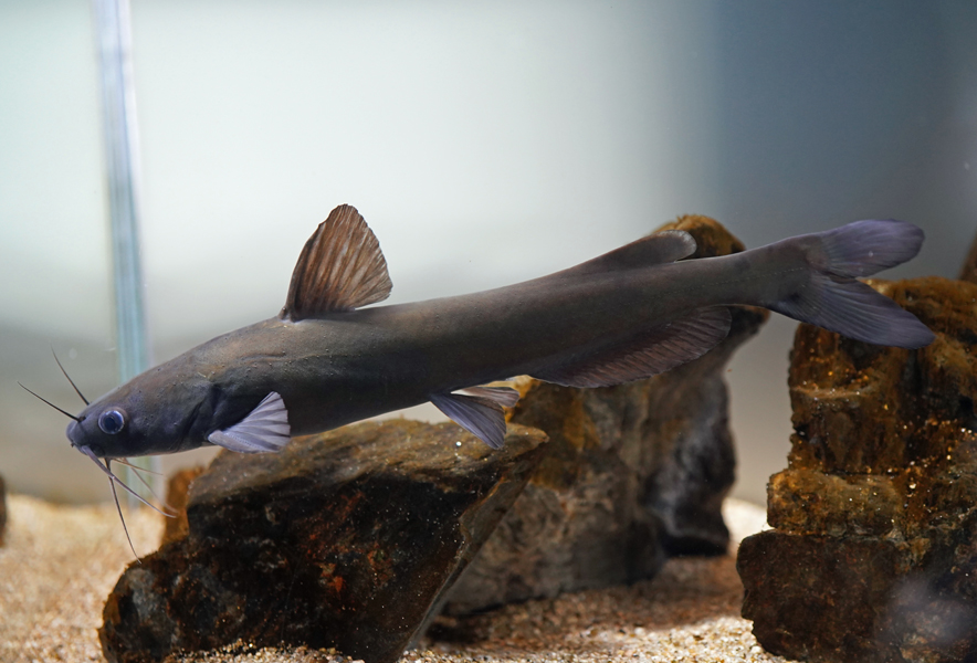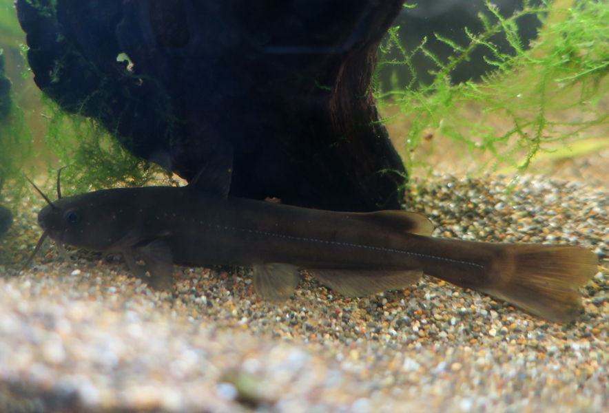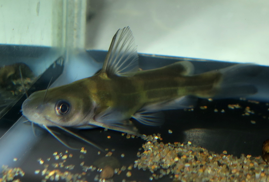 小さいうちは体側には金色の模様がはいりますが、成長すると一様に暗色になり、同じギバチ属のギバチと似たところがあります。顔には8本のひげがあり、大きくくりっとした眼がかわいい魚です。