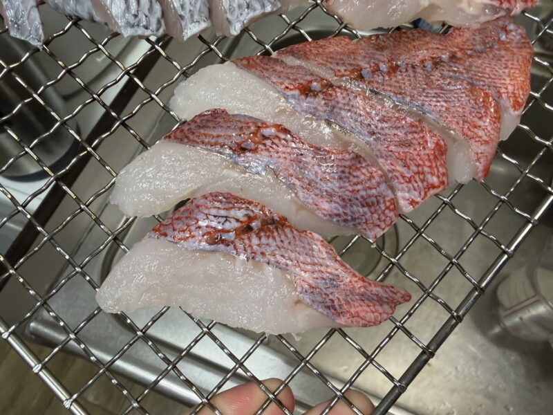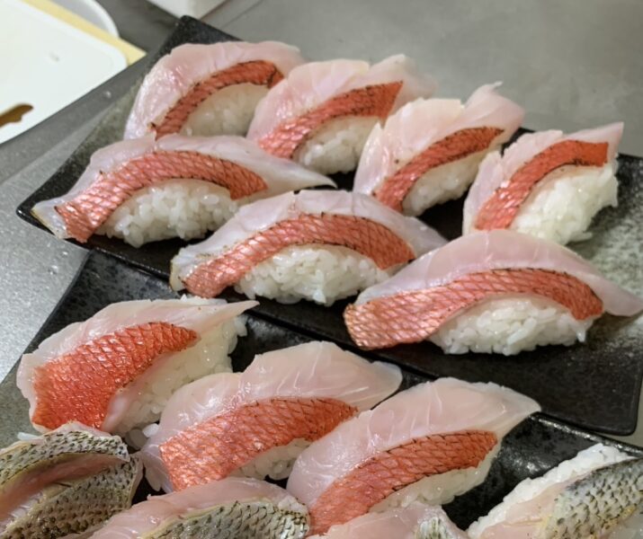 キンメダイのお寿司(提供:たつ)淡い桜色でとても上品な見た目となりました。調味料を使わずとも、最初の一口で深い甘味を感じます。煮付けとは全くちがう表情を見せてくれました。
