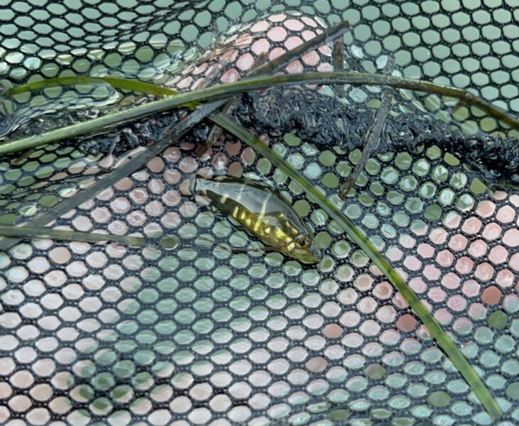 日が傾き始め、次々と多種多様な幼魚が網に入る中、ふと小さく金色に光る魚が目に入りました。