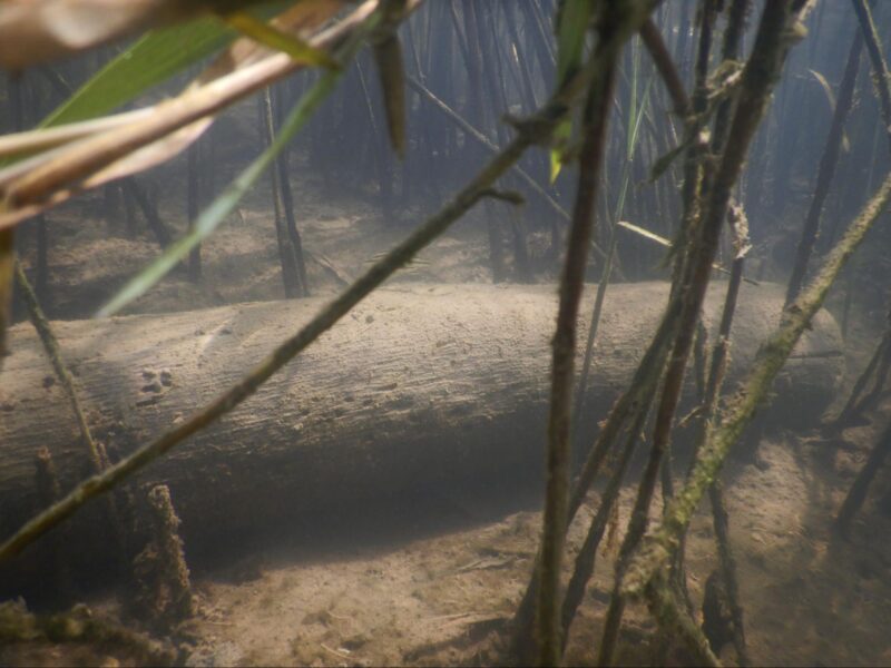 沈んだ流木や水生植物の周りは、幼魚たちの絶好の隠れ家となっていた(撮影:川鮫工房)気を取り直し、胴長に履き替えて、事前に調べてきたポイントを巡ります。真夏の灼熱の暑さに加え、熱中症に怯えながら、私は女性特有の体調不良も発生してしまい、徐々に過酷なガサガサへと変貌していきました。