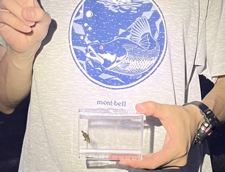 mont-bellのアカメTシャツとアカメの幼魚で記念撮影(撮影:川鮫工房)実際に自然の中へ足を運ぶことで、その生き物がどういった環境で暮らしているのか、どんなところが居心地が良いのか、初めて行く場所、何度も訪れたことがある場所でも、その度に新しい気づきや発見があります。