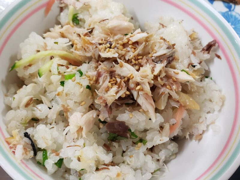 サバの干物のちらし寿司(提供:こやまゆう)焼いたサバの干物から骨をとり、身をほぐします。きゅうりを千切り、紅ショウガとシソを細かく刻み、サバと一緒に酢飯に混ぜ込みます。