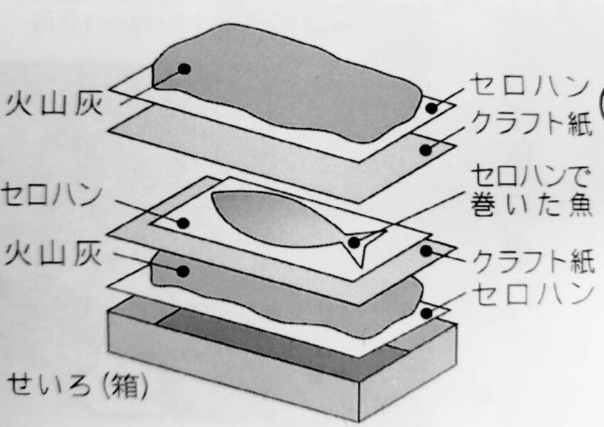 さらに上からクラフト紙とセロハンをかぶせ、火山灰で覆って寝かせます。サバに直接灰が触れないよう、セロハンとクラフト紙でサンドウィッチ状に挟むのです。