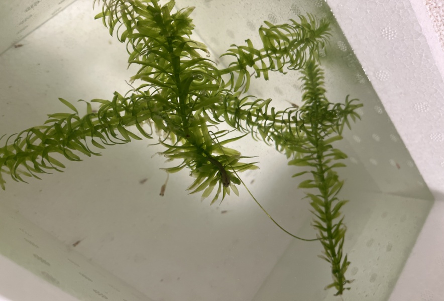 イモリが水面近くで休めるように水草(アナカリス)を数本まとめて浮かべて観察します。