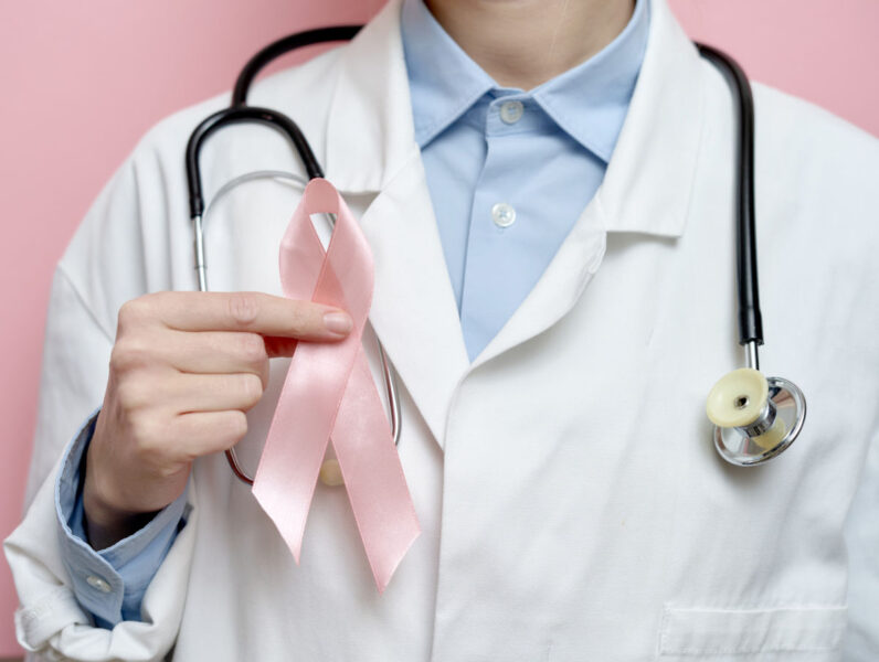 ピンクリボンを持つ医師(提供:PhotoAC)