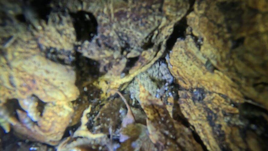 また、潜水調査ではカワムツの稚魚と思われる魚の群れのほか、水深4メートル地点で越冬中のツチガエルの撮影にも成功。滝壺の水深4メートルにおけるツチガエルの確認は珍しい事例だといいます。