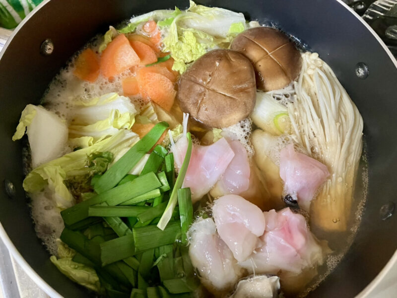 まずは野菜やきのこ類をざく切りし、沸騰した鍋つゆの入った鍋に入れていきます。野菜に火が通ったら、下処理をしたアンコウを加え、全体に火が通れば完成です。