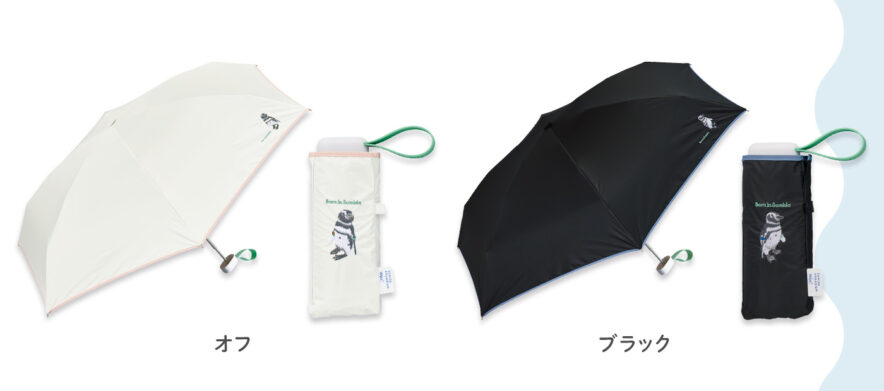 折りたたみ日傘は2タイプ。1つは、すみだ水族館生まれのペンギンが左羽につけている“メロングリーンのカラーバンド”と同じ色のゴムバンドを持ち手に採用した「遮光おそろいパラソルミニ」。