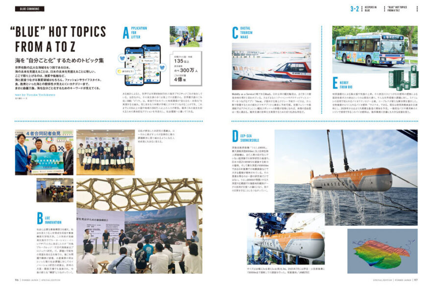誌面では、売上600億円を目指すという「ウニ」に関するスタートアップ、企業の自然資本開示に寄与する「生物多様性ビッグデータ」をつくり上げた企業、藻場再生で海を復活させる産学金融連携の現場など──世界6位の広大な海を擁する海洋国家・日本が世界でリードするブルーエコノミーの最先端を解き明かします。