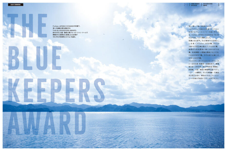 THE BLUEKEEPRS AWARD(提供:リンクタイズグループ)また海への貢献企業を表彰する「THE BLUEKEEPERS AWARD」も取り上げられています。Forbes JAPANとOCEANSが共催する同アワードは、昨年9月に大阪・関西万博ブルーオーシャン・ドームで授賞式が行われ、登壇した5社がそれぞれの革新性とビジョンを誌面で語っています。