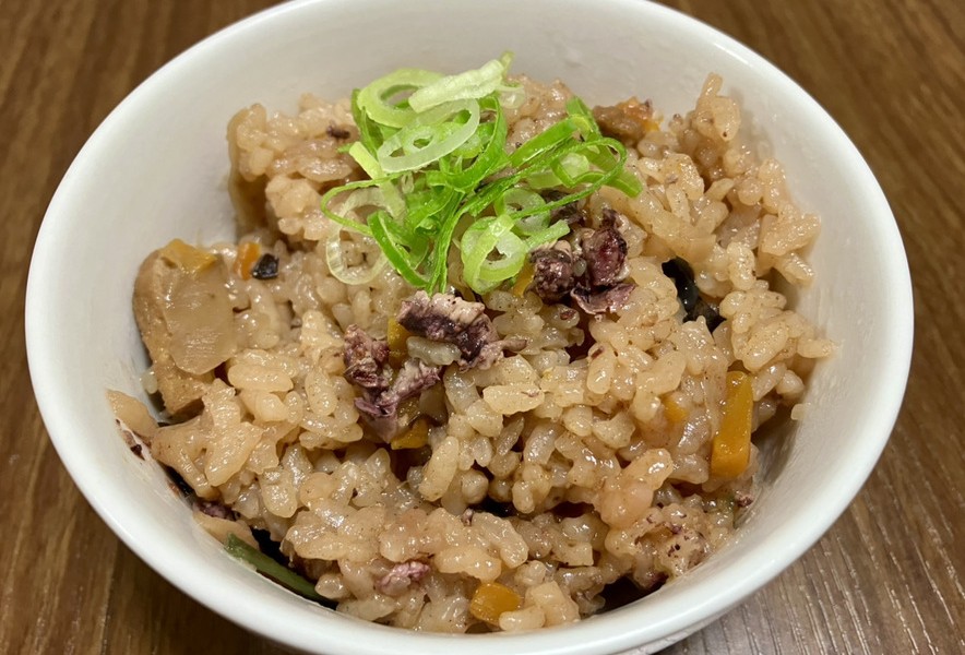 ホタルイカの沖漬けの炊き込みご飯(撮影:井村詩織)炊き上がったごはんを一口食べると、ホタルイカの沖漬けならではの濃厚な旨味が口いっぱいに広がり、思わず「おいしい!」と声が出ました。ごはん全体にホタルイカの味が染みている、贅沢な炊き込みご飯でした。