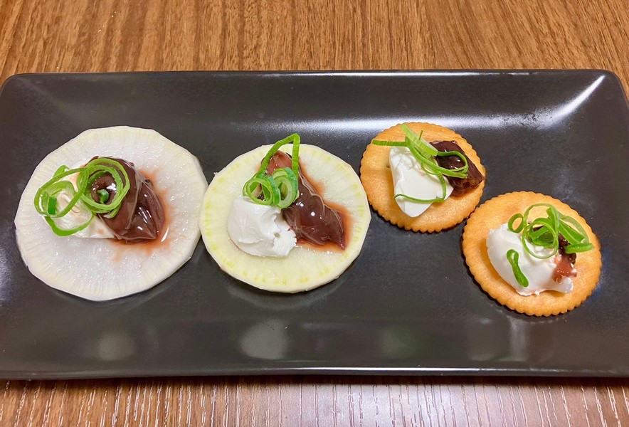 クラッカーに乗せたものは、クラッカーと沖漬け、クリームチーズのそれぞれの味や食感が強く、やや喧嘩している印象。使用したクラッカーはかなり塩気も強かったので、塩味を抑えたクラッカーを使えば、全体のバランスが変わったかもしれません。