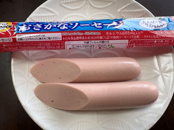 塩分を30%カットしDHAとEPAを配合するなど、健康志向の方が安心して食べられそうです。見た目は一般的な魚肉ソーセージですが、塩分がカットされていることもあり、少し薄味な印象がありました。