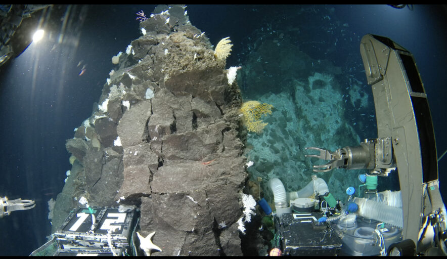 七曜海山の一つ頂上付近に接近する「しんかい6500」(提供:The Nippon Foundation-Nekton Ocean Census/©JAMSTEC)これらの海域では高密度の海綿群集をはじめとした、鮮やかな生態系の存在が確認されています。また、ガラス海綿に共生する2種のゴカイをはじめ多数の種が観察・採取され、その生態も明らかにされました。