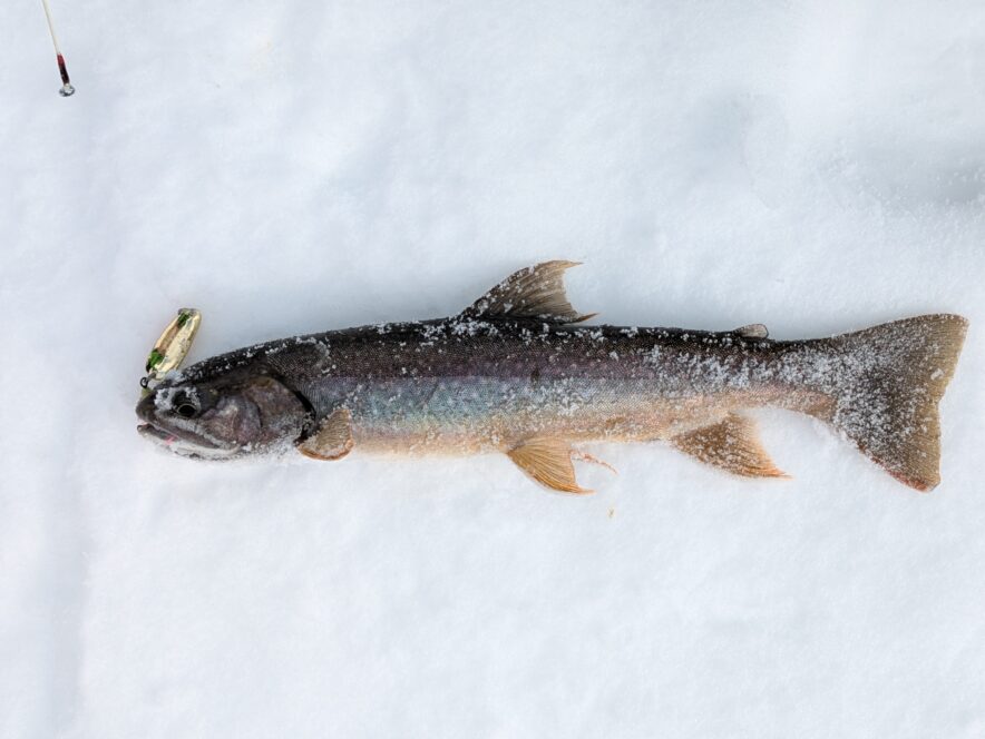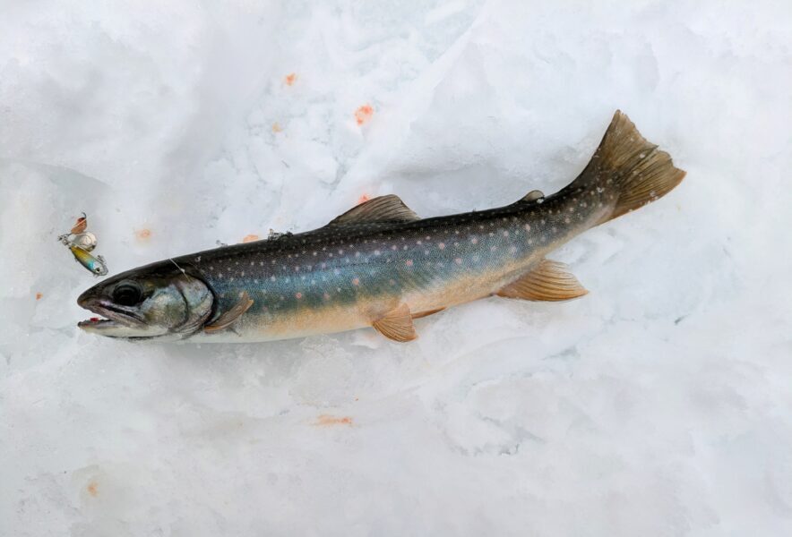 ミヤベイワナの艶姿(撮影:魚屋天然堂)穴を開けた場所がよかったのか、しばらくアタリが連発するウハウハな状態。しかし、ハリがかからなかったり、途中で外れてしまうこともしばしば。それでも姿を見せる美しい姿の一匹一匹に感動することができました。