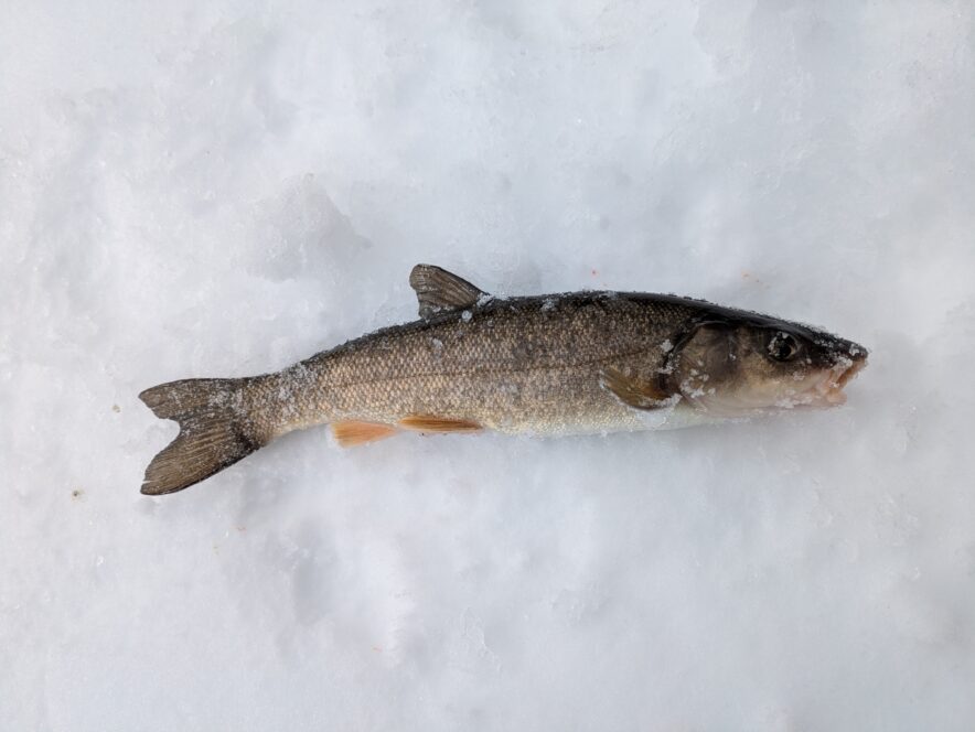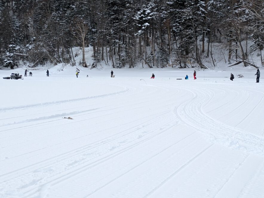 あちゃ~っと引っ張ると、かなりの重量感で「枝にかかったのか……」と思いきや、仕掛けが氷に届くあたりで「グンッ」と引き込まれて釣り糸が切れてしまいました。