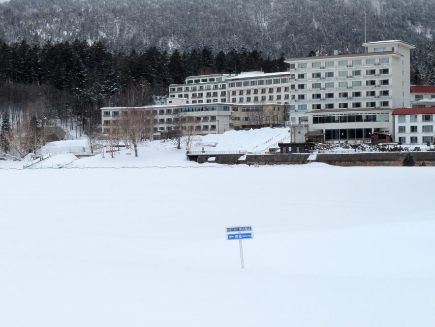 釣り場からの絶景(撮影:魚屋天然堂)釣り場は、温泉ホテルやネイチャーセンターのある場所から10~15分程度氷の上を徒歩で進んだ、「3の湾」と呼ばれる場所。