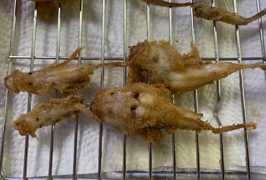 ミドリフサアンコウの小型個体の唐揚げ(提供:椎名まさと)皮を剥いで、内臓をとった後、唐揚げ粉をまぶして揚げます。