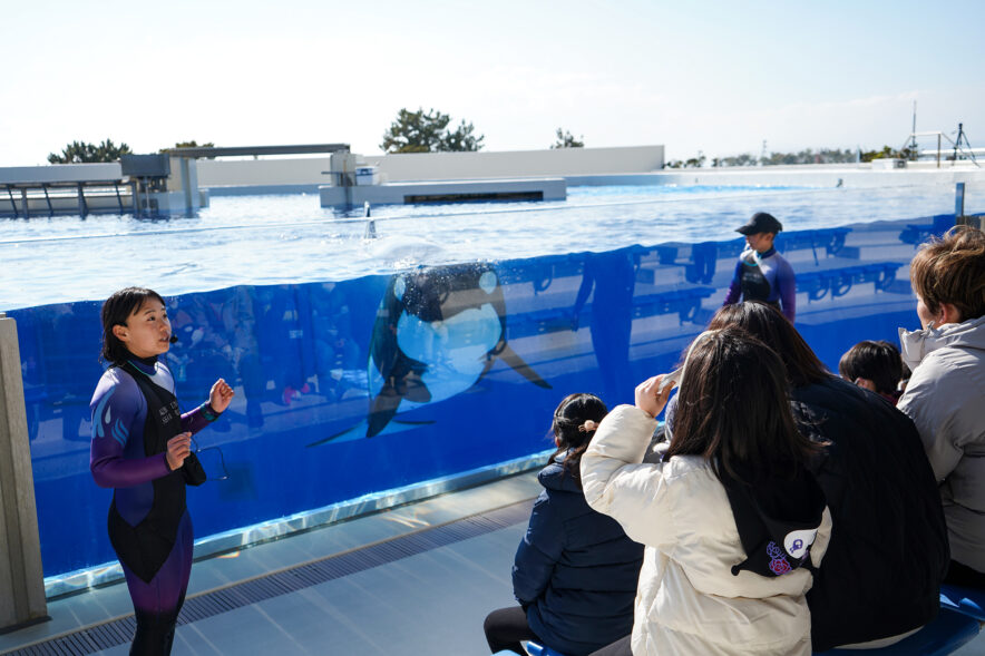シャチをテーマにしたプログラム「シャチについて学んでみよう!」では、トレーナーによるレクチャーの後、シャチを間近で観察しながらその特徴や暮らしについて学びます。
