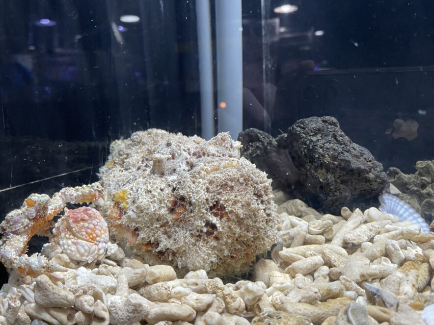 本企画展では、岩そっくりの姿で海底に潜み、背びれに猛毒の棘を持つオニダルマオコゼや、軽石のような凹凸の甲羅で岩石に紛れるカルイシガニなど、多彩な“隠れ方”を見せる生きものが展示されます。