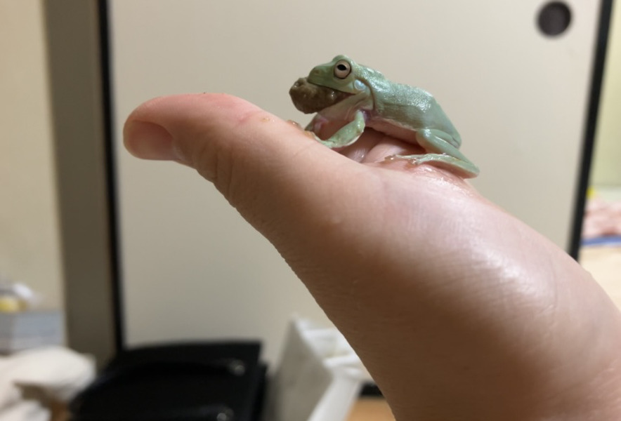 人工餌を食べるイエアメガエル(提供:井村詩織)ハニーワームをピンセットで与え、ピンセット給餌に慣れさせてから、ハニーワームに少量の人工餌をつけていたことで匂いや味を覚えたのか、今では指で人工餌をつまんで差し出しても食べてくれるようになりました。