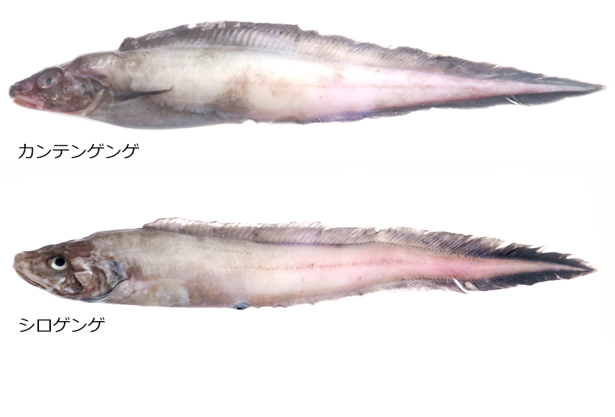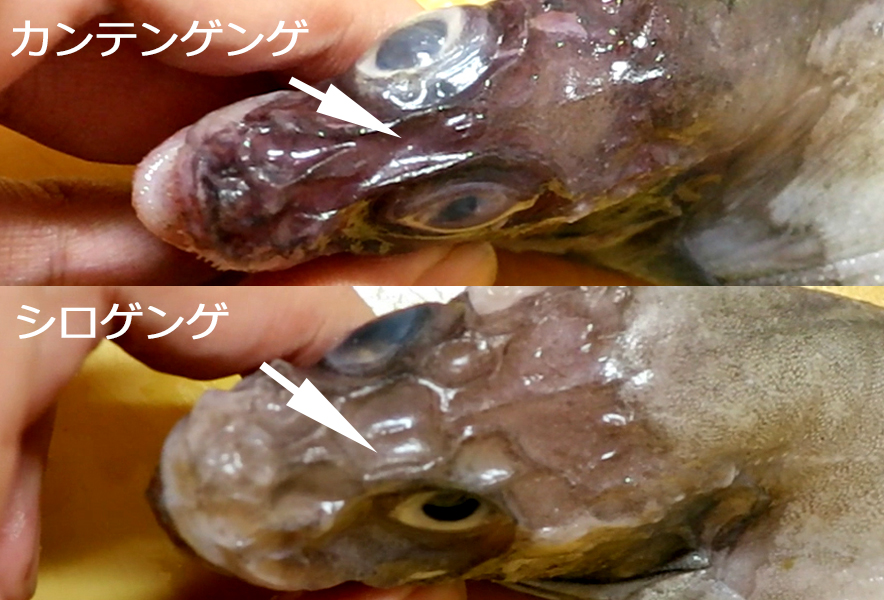 カンテンゲンゲとシロゲンゲ(提供:椎名まさと)カンテンゲンゲの頭部は側扁していますが、シロゲンゲはそうではなく、眼隔幅はカンテンゲンゲよりもシロゲンゲのほうが広いことが特徴です(カンテンゲンゲでは両眼隔幅は頭長の8.6~12.4パーセント、シロゲンゲでは両眼隔幅は頭長の9.7~17.4パーセント)。