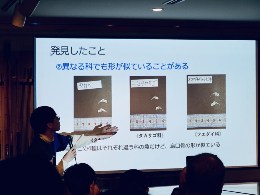 鯛の鯛についての発表(提供:SAKANA BOOKS)普段は捨ててしまいがちな骨や鰓耙の中に、その魚の暮らしが詰まっている──そんなことを改めて教えてくれるトークライブでした。
