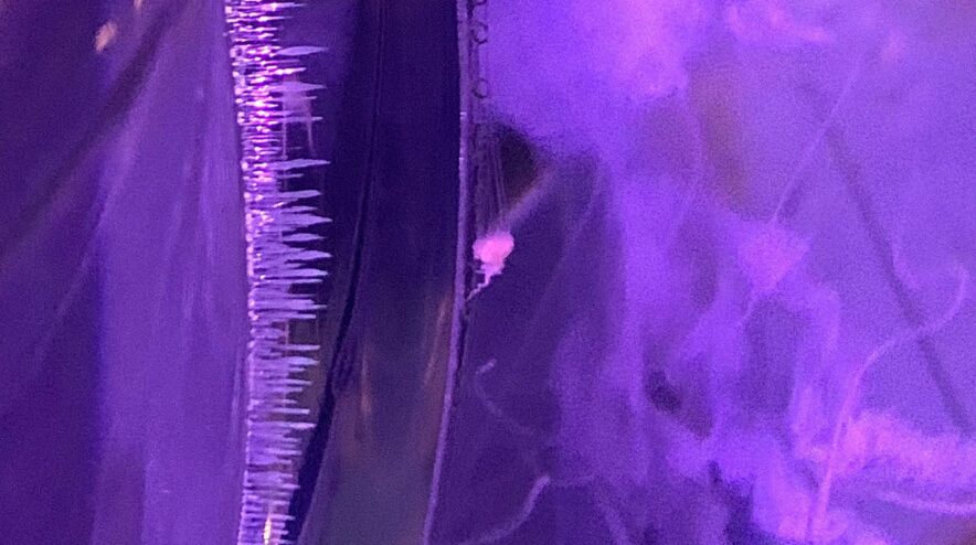 ポリプとはクラゲになる前の段階の姿。イソギンチャクのような姿で、種類によってはクローンを作って増殖し、水温や成長段階などの条件がそろえばクラゲを放出します。