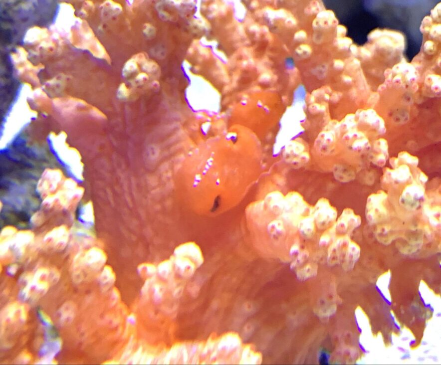 幼魚水族館(静岡県駿東郡清水町)では、種類は不明ですが、ベニウミトサカというサンゴに共生していると見られる同じ色のホヤを見つけることができました。