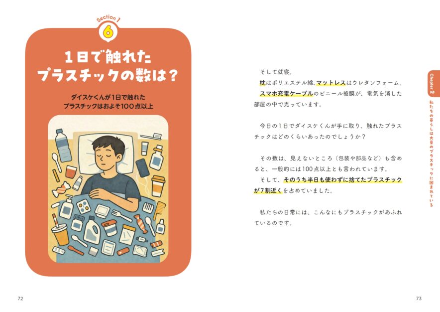 本書の特徴的なパートが、高校生「ダイスケくん」の1日を追いながら、朝起きてから夜寝るまでに触れるプラスチック製品を数えていくチャプターです。