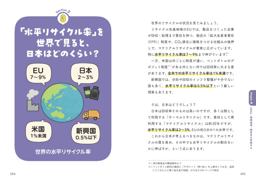 海・陸・空へと広がる汚染、リサイクル最前線の動き、世界各地のサステナブルな取り組みなど、資源が循環する社会の全体像を、イラストと解説の見開き構成で学べます。