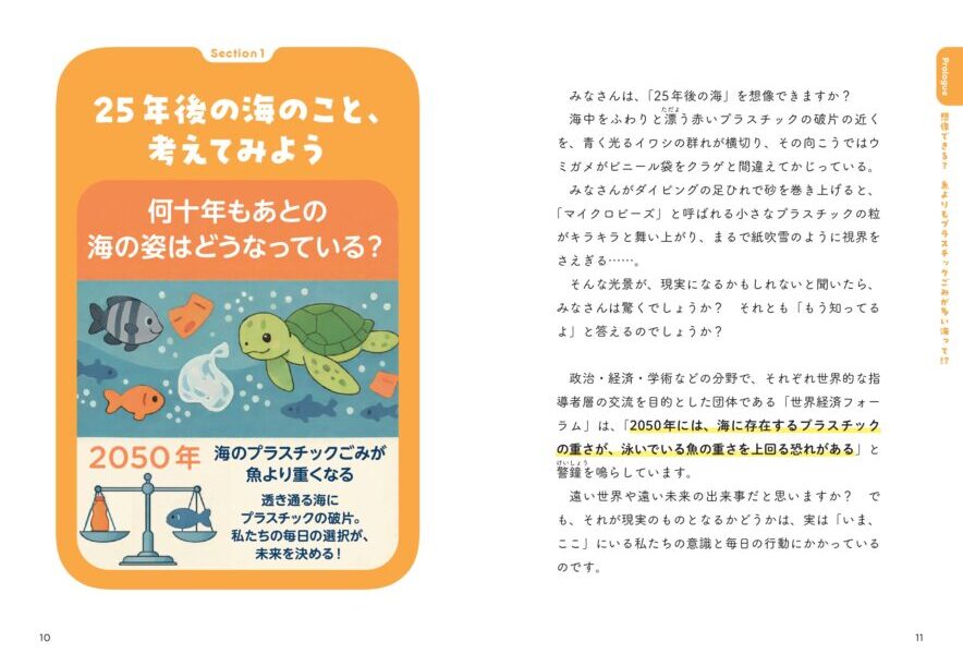 読者自身が「今日使ったプラスチック」を書き出して数えるミニワークも盛り込まれており、「気づくことが行動を変える第一歩」というメッセージを体験的に理解できる構成となっています。