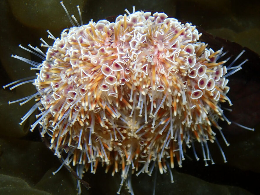 他のウニとは異なり先の尖った棘は持たないものの、「叉棘(さきょく)」と呼ばれるラッパ状の棘で噛みついて毒を注入します。しかし、見た目は綺麗で可愛いので、まさか触手やラッパのような管が肉に噛みついてくるとは思いもしないでしょう。