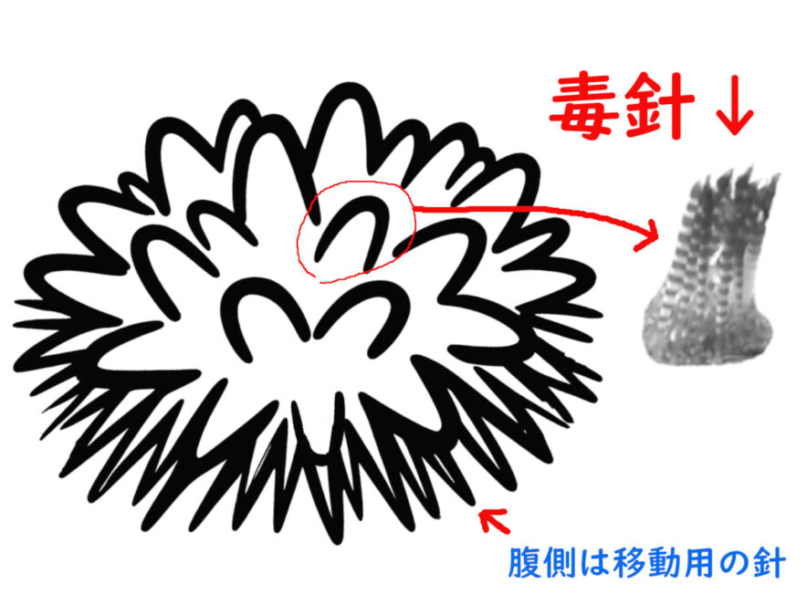 イイジマフクロウ二のイメージ(作図:額田善之)腹側の棘は移動用の棘で、背中側に毒針を仕込んだ赤〜黒色と白色の縞模様の棘があります。この棘は十数本以上の束になって背中側に無数に生えており、触れたら最後、毒針が飛び出してくる地雷のような毒ウニです。